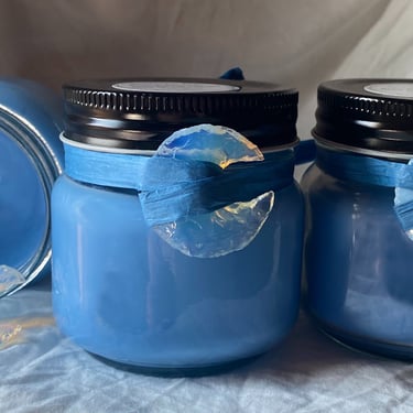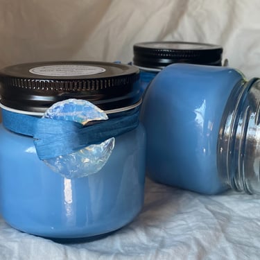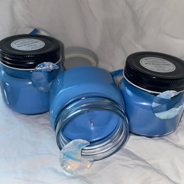 Essential oils and fragrances of Dragons Blood and Egyptian Amber. Every candle is hand poured and comes with an Opalite Moon Crystal and blue raffeta ribbon tied on. Candles are poured into an 8oz mason jar with lid. Jars are 3" high.