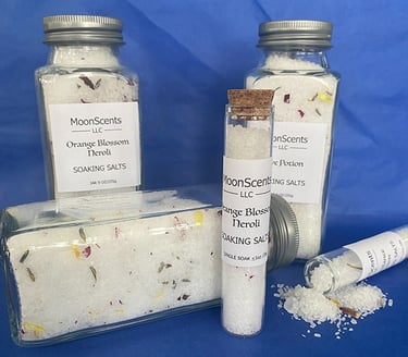 The Soaking Salts: MoonScents soaking salts bring your intention to another level as you soak in it! Sea salt& epsom salts are gently combined with organic dried flowers and oils to create a softly scented perfumed bath soak. The single soaks are enough for one bath, the jars and bags contain enough for several baths, depending on your need. You can add these soaks to your own epsom or sea salts too. You will emerge scented and ready to bring in your intention!